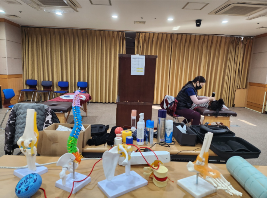 테이핑, 진동건 테라피, MCT 근막이완 등 진행 케어 후 관리법 및 스트레칭, 운동처치 진행
